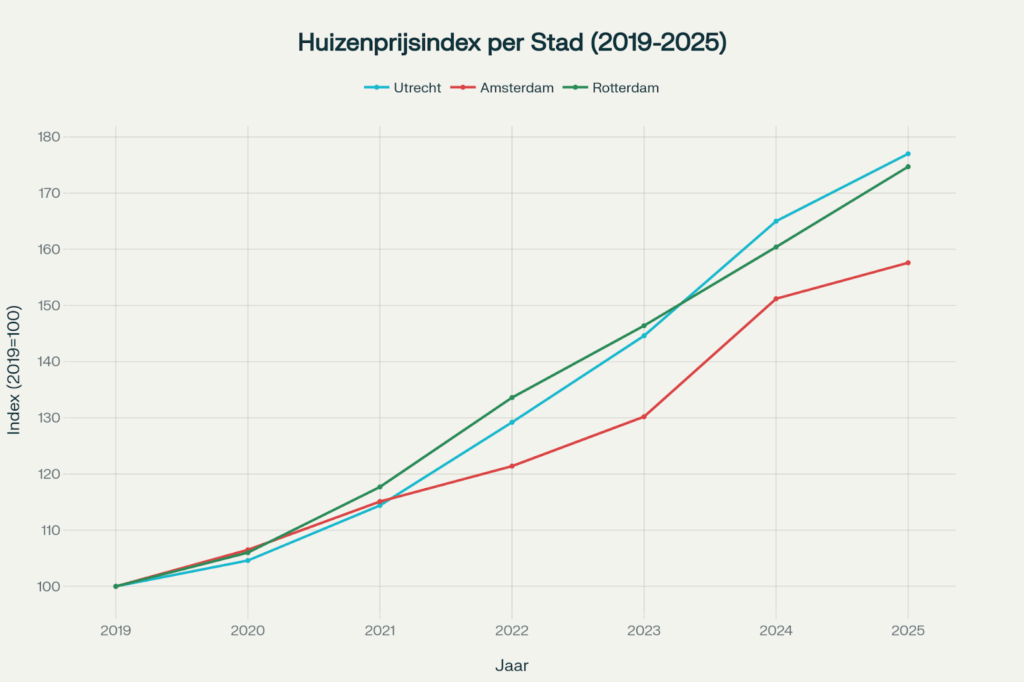 De huizenprijzen in Utrecht stijgen in 2025 met ruim 10% jaar-op-jaar, de sterkste groei van alle grote steden. De gemiddelde verkoopprijs bedraagt nu ca. €575.000.